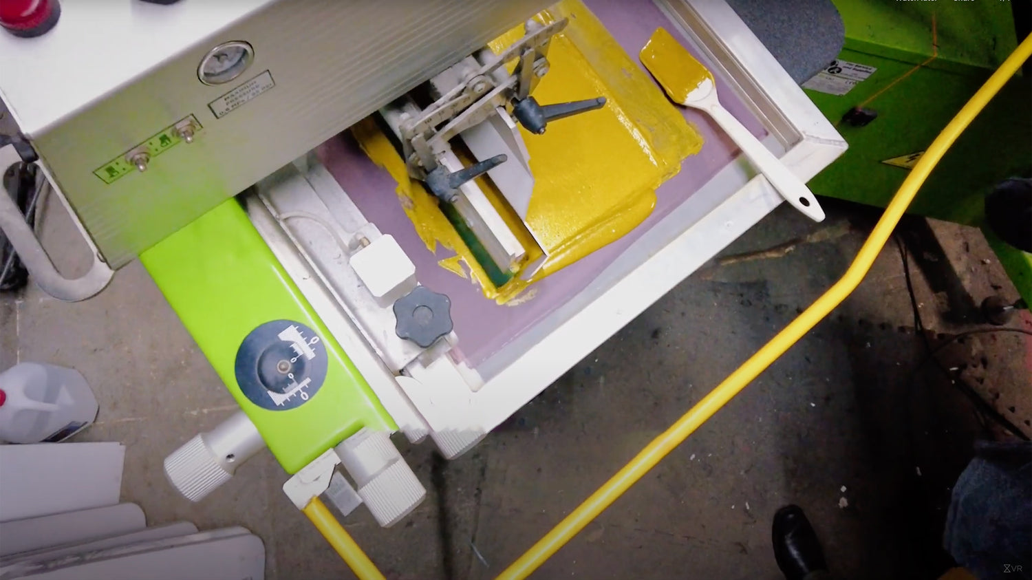 Apply the ink: Ink is spread across the screen with a squeegee. The squeegee pushes the ink through the mesh in the areas where the stencil is open.